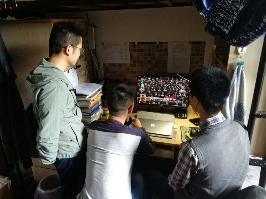 男生在执信西斋235寝室集合,准时收看十九大开幕式直播。党员戴康表示,“喜迎十九大,做合格党员”并不仅仅是一句口号,它必须被落实到实践中去,作为青年学子、同时也是共产党员,我们必须在自己的实践生活中努力奋进、积极进取,从一点一滴的小事做起,不断提升自己的思想和知识境界,不断提高自己为社会奉献、为人民服务的能力和水平。我们对国家和民族的未来必须充满希望,用自己的努力去报效祖国和人民,只有这样,我们才能无愧于共产党员的身份,无愧于党和国家对我们的培养和希望。