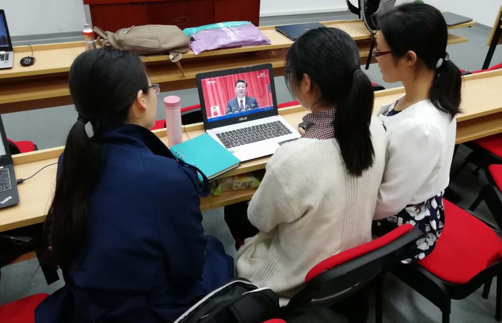 女生党员在机械楼206集体观看十九大的直播,党员吴金鹏表示,在观看直播中,她深深地为自己是中国人而感到骄傲。从纳米之微到万里之遥,一寸寸刻度延展着奇迹,一个个梦想见证着历史。党的十九大是在我国全面建成小康社会决胜阶段召开的一次重要代表大会,号召我们不忘初心,牢记使命,高举中国特色社会主义伟大旗帜,决胜全面建成小康社会,夺取新时代中国特色社会主义伟大胜利,为实现中华民族伟大复兴的中国梦不懈奋斗。“作为青年一代,见证了过去五年的巨大变化,同时也感受到了自己的责任和使命,砥砺前行,未来可期!”