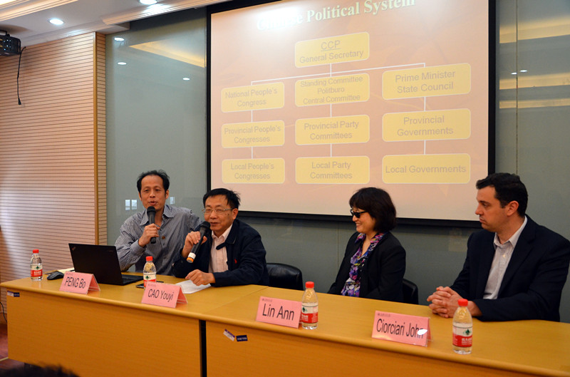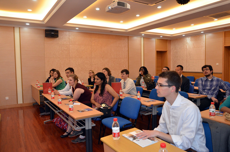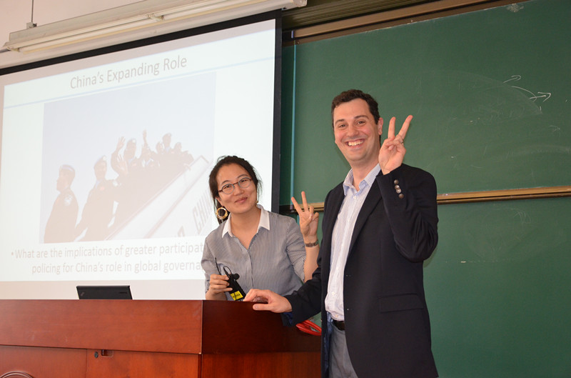 课堂上,美方随行教师JohnD. Ciorciari教授就联合国如何通过向事发地派驻警务人员以应对地区冲突进行了热情洋溢的讲演,双方师生就此主题展开了友好而深入的探讨。讨论取得了令人满意的效果,不仅双方师生能够“零距离”地进行交流,更显示了中美两个大国的莘莘学子为共同所关心的国际问题,以各自不同视角进行深入分析和交换意见。