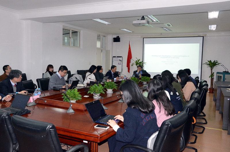 Anthony Saich教授还受邀在机械楼307室为国务学院师生解读经济与安全二元格局视角下的亚洲领导权问题,Saich教授认为,随着中国在亚太地区的影响力逐渐增强,中美双方应共同探索一个未来合作的框架,合作领域涵盖全球共享、全球参与及全球监管。