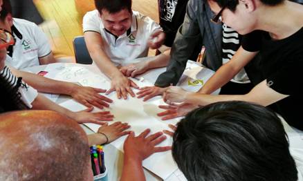 吴怡烨指导学员和志愿者们随机一对一结对并分成四组,并依次进行了“击鼓传递”、“自画像”、“队旗制作”等内容丰富而趣味十足的游戏。随着这些游戏的开展,学员和志愿者之间的交流与互动逐渐增多,现场气氛越来越热烈。中场休息环节,“阳光之家”的学员们热情依旧,主动要求上台表演节目,使整场的热烈气氛不减反增。