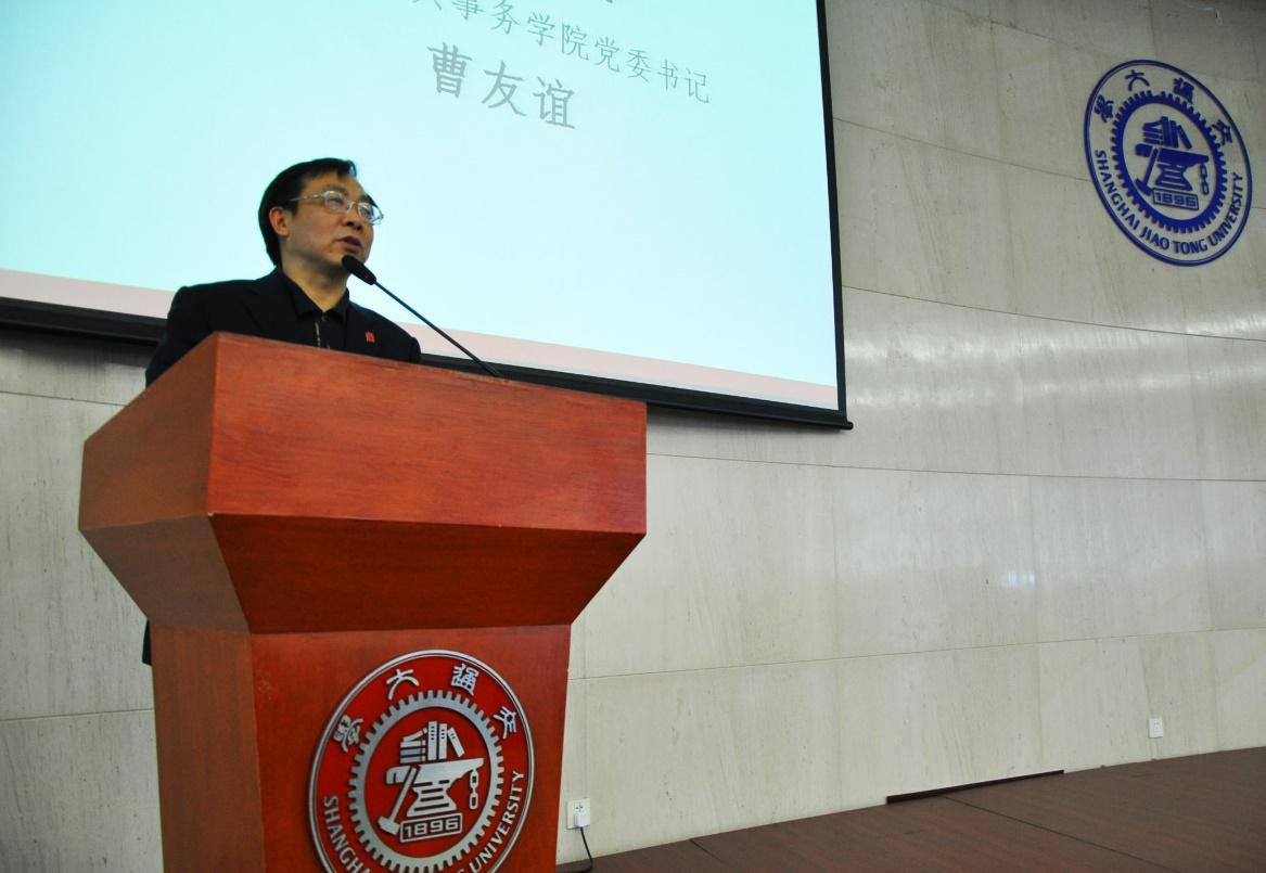 曹友谊从思想理念、制度建立、行动落实三方面对“学在交大”进行阐述,他指出“学在交大”是学校人才培养理念深化和完善的集中概括,学院将按照学校十次党代会的精神,以学生的健康发展为核心,为建设人类共同体而培养人才,努力为交大学子带来最大的教育增值;同时,“学在交大”的落实需要制度支撑,要通过制度保证资源向人才培养投入,保障人才培养核心地位的巩固;“学在交大”贵在行动落实,国务学院师生应积极行动、践行“学在交大”,努力成为全校的排头兵。