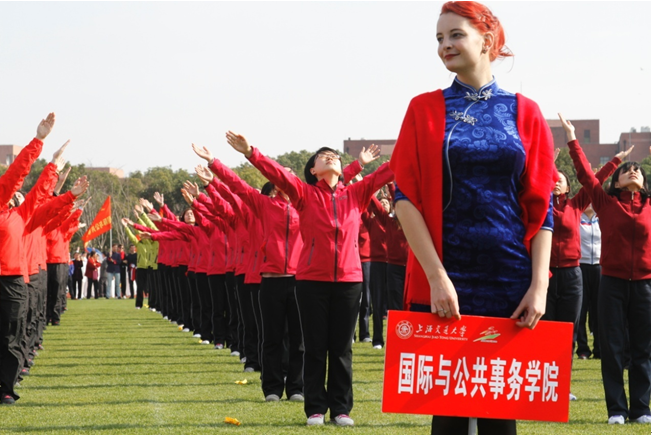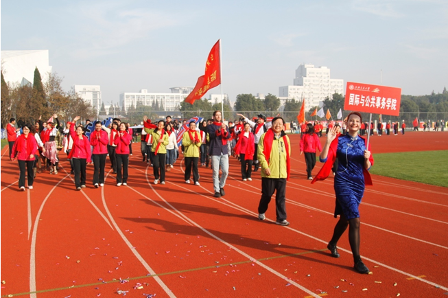 开幕式上,国务学院由23名教职员工、24名中国学生、22名国际硕士班学生组成的近70人巡游方阵,身披红色围巾,劲头十足,朝气蓬勃,成为运动场上靓丽的风景线。巡游方阵在常务副院长吴建南的带领下,高举学院旗帜和院徽,在经过主席台前,师生们欢快地跳起了舞蹈,营造出浓浓的嘉年华氛围。国务学院多元化、国际化的巡游创意从交大各院系研究所、机关部处、附属单位共63家单位代表组成的巡游方阵中脱颖而出,最终荣获上海交大第45届运动会巡游入场式一等奖。