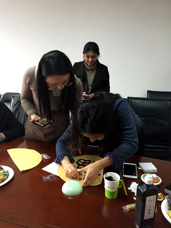 她随后现场演示研墨、握笔、提笔、落笔等过程,在场老师一同观摩学习,令女教师们受益匪浅。