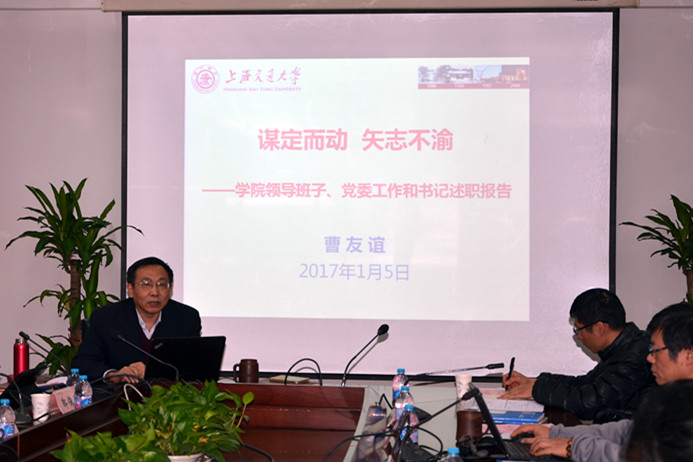 曹友谊书记围绕“谋定而动、矢志不渝”这一主题作学院领导班子、党委工作总结和述职报告。曹书记指出,在学校领导的大力支持下,学院党政班子积极谋划布局,学院教师积极参与贡献集体智慧,学院发展路径越来越清晰和坚定,成功召开了学院第一次党代会,两学一做取得阶段性成果,中国城市治理研究院将为学院学科建设构建新的平台,在未来取得更多、更突出的学术成果。