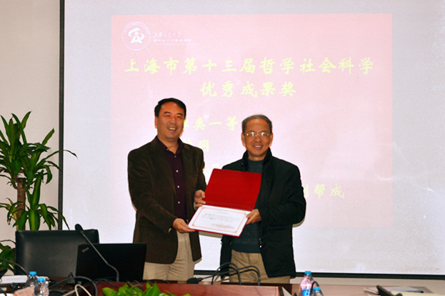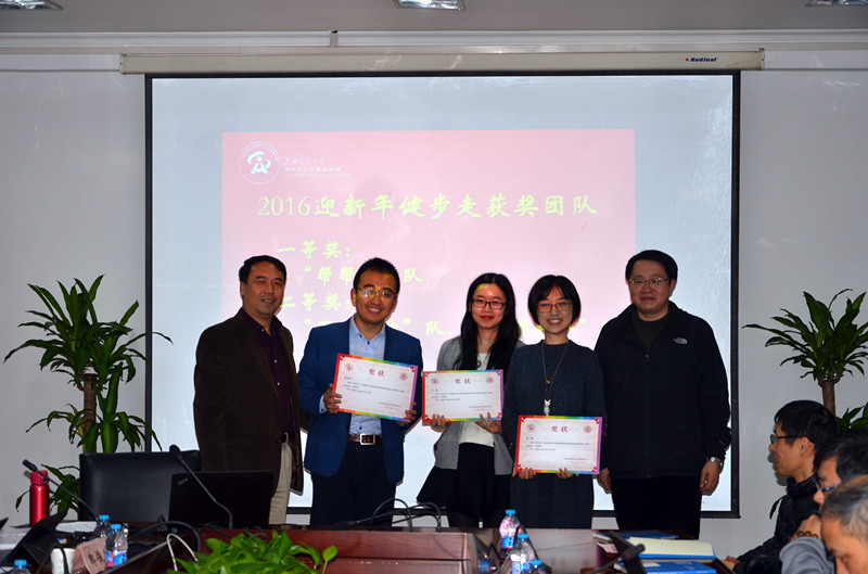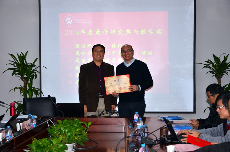 国务学院党委书记曹友谊宣读获得2016年度各类先进表彰名单,院长钟杨为获奖教师颁发证书。颁发奖项包括上海市社科优秀成果奖、学院优秀奖、迎新年健步走团队奖和个人奖以及“两学一做”党员征文比赛优秀奖。