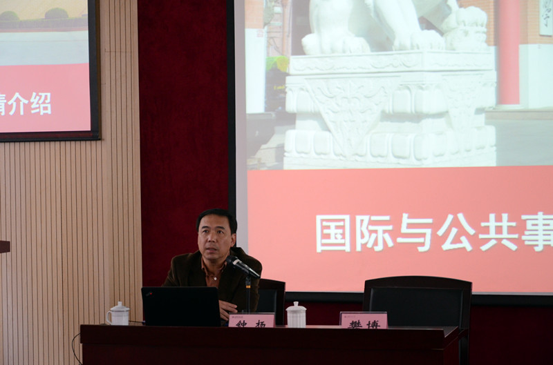 卢永华大使主讲“中国外交和当前国际形势”,钟杨院长主持讲座。卢永华曾任中国驻奥地利共和国特命全权大使,现任中国前外交官联谊会理事,中国国际友人研究会理事等。卢大使首先介绍自己在外交领域的工作经历,随后介绍使馆的人员结构、任务功能等等,结合他的个人经历生动地讲述了中国外交的过去和现在,并就当前国际形势进行了分析与评论。