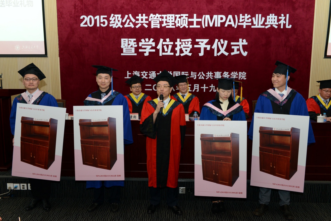 最后环节为毕业捐赠仪式。值此学院回搬新建楼之际,全体2015级MPA毕业生向学院赠送了4个会议室茶水柜,感谢母校的悉心培养。姜文宁书记代表学院接受了赠礼,并对毕业生们表达了“前程似锦”的毕业祝福,希望大家发扬母校“饮水思源”光辉传统。