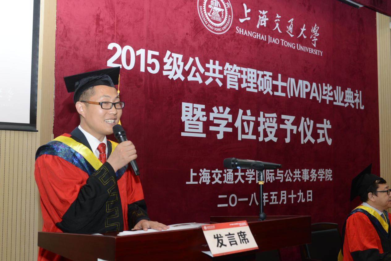 上海市金山区农业委员会副主任冯春欢和嘉兴市委办公室副处长倪海粟作为2015级MPA毕业生代表发言。冯春欢表示,经过了三年的学习让她思路更加宽广、文思更加敏捷、表达更加清晰、为人更加包容;倪海粟表示,在交大两年半的系统学习,让他的理论素养达到了一个新高度。
