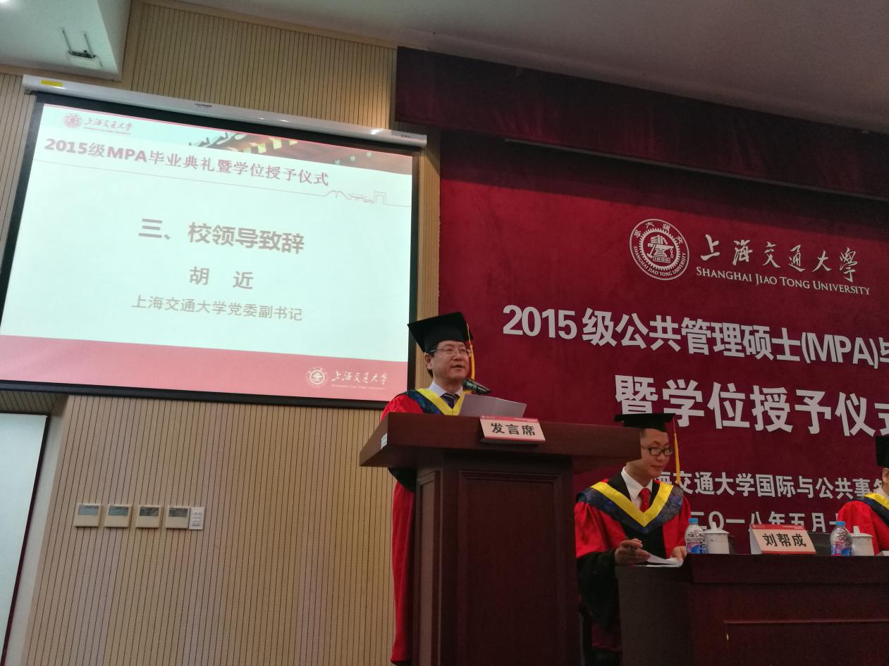 首先,上海交通大学党委副书记胡近代表学校向圆满完成学业并获得公共管理硕士学位的各位毕业生表达了热烈祝贺。他指出,各位交大MPA毕业生一定要永远保持独立思考、不懈奋斗的精神,把张扬的个性转变为人格的独立与健全,把纯真的情感转化为内心的丰盈与善良,合格地扮演人生中的各种角色。