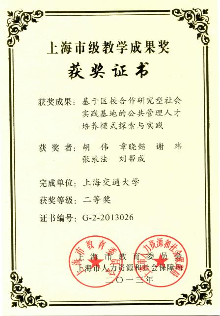 2014年,以胡伟教授作为第一完成人的《基于区校合作研究型社会实践基地的公共管理人才培养模式探索与实践》项目获得高等教育上海市级教学成果二等奖。该项目已连续运行近十年。