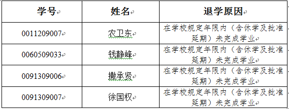 根据《普通高等学校学生管理规定》(中华人民共和国教育部令第21号)第二十七条,以及《上海交通大学研究生学籍管理实施细则》(沪内交(研)[2015]118号文)第三十五条规定,拟对农卫东等4名博士生作退学处理。请在2017年5月31日之前联系教务老师办理相关手续;如您对学籍处理有异议,请在2017年5月24日前联系学院教务办,提供申辩理由及相关事实依据。逾期不作任何反馈的,将视为您对我校的退学处理没有异议。名单如下: